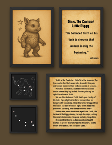 Wide-eyed and eager, Oinx, Porculon’s son, scampers among the stars, squealing his curiosity to every constellation. Who are they, and why do they shine so bright? He has a great tusk, like his father’s, which also points north. Upon its tip rests Truth itself. What Porculon drags from muck, Oinx looks upon with curiosity and wonder.