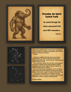 Father to Oinx, Porculon is the god of what cannot stay buried. Never dipping below the horizon, he roots in muck and filth, dragging from the mire things some would rather remain hidden. His great Spiral Tusk points straight at Truth, and is etched with Brinna Swillborn’s Spiral Constant, said to be both prophecy of and salvation from an impending cataclysm of cosmic scale.