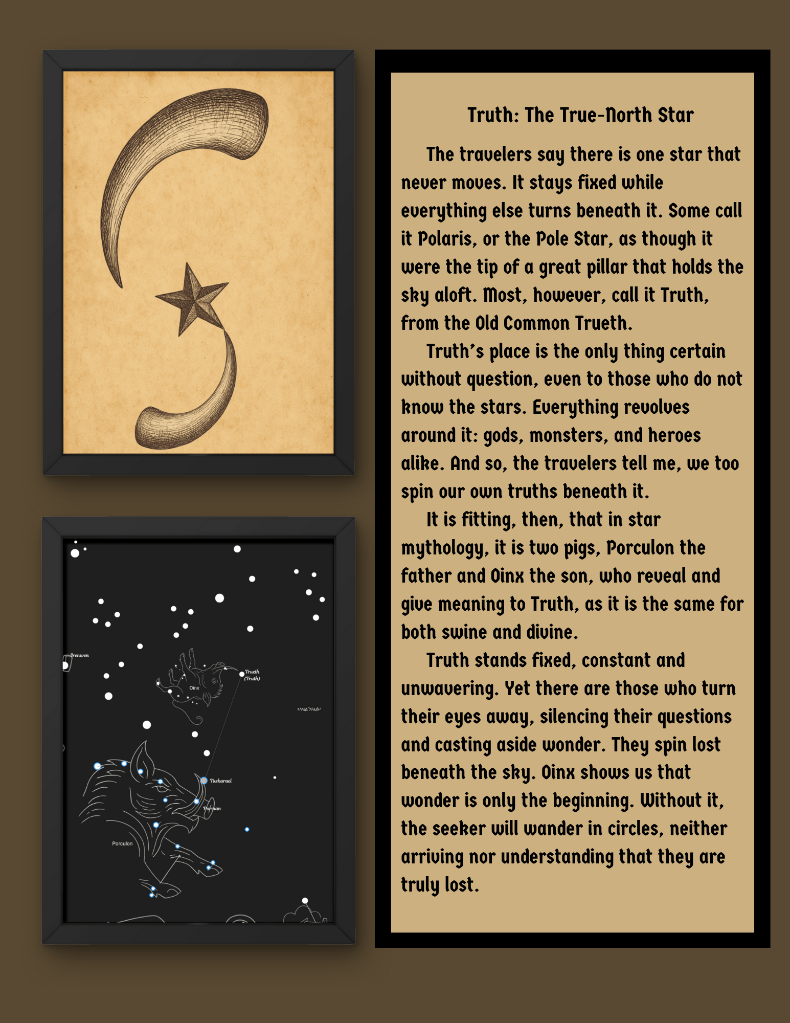 Wide-eyed and eager, Oinx, Porculon’s son, scampers among the stars, squealing his curiosity to every constellation. Who are they, and why do they shine so bright? He has a great tusk, like his father’s, which also points north. Upon its tip rests Truth itself. What Porculon drags from muck, Oinx looks upon with curiosity and wonder.